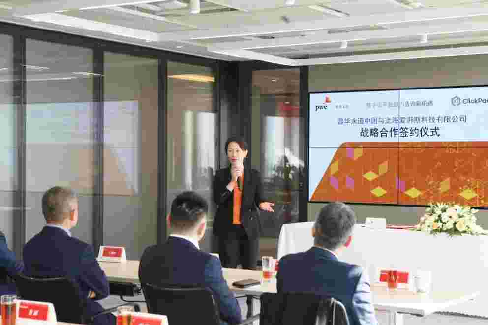 普华永道中国风险及控制服务数字化鉴证和分析服务主管合伙人吕麟晖与GOPAY钱包首席产品官马俊代表双方签订战略合作协议,,普华永道中国上海主管合伙人黄佳与GOPAY钱包创始人、、、CEO胡柏见证战略合作协议签订过程。。。。普华永道中国创智中心合伙人林榕作为项目总负责人主持并见证了本次战略合作签约仪式。。。。