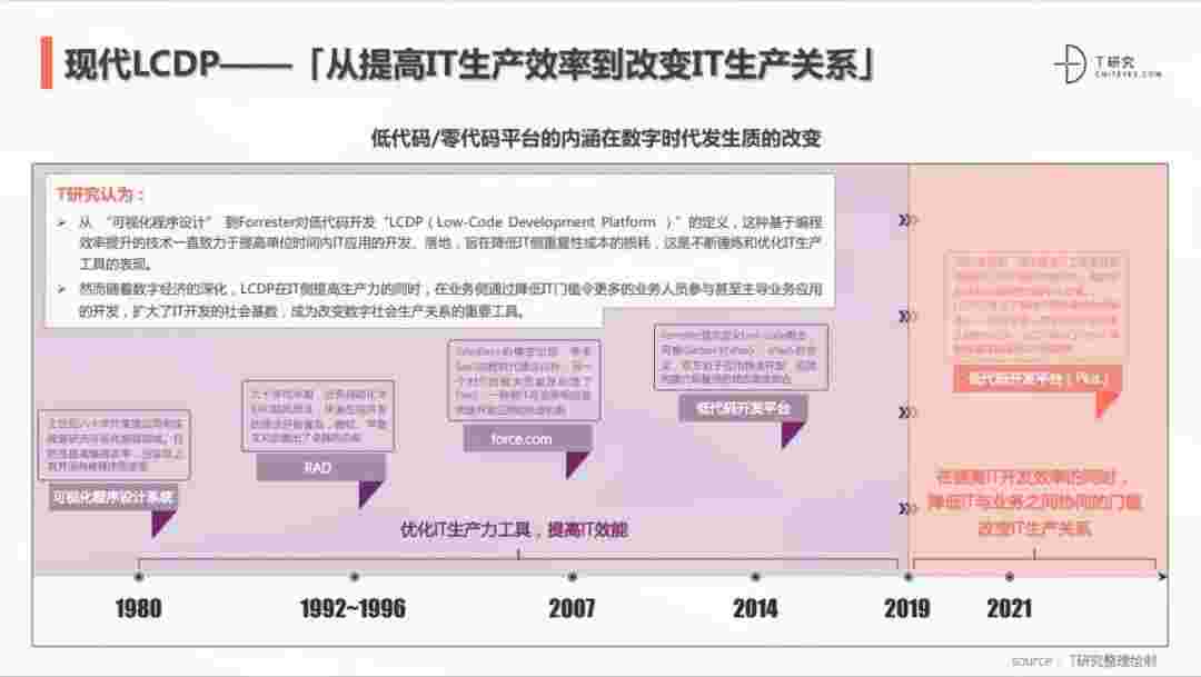 2020年前后,,源于提高IT工作者开发效能的LCDP不断进化和衍生,,,,面对业务导向日益明显的数字化变革。。LCDP衍生出了面向不同对象的升级服务——面向专业人群的LCDP和业务人群的NCDP,,,,LCDP与NCDP的不同服务属性被逐渐认可和接受。。。 LCDP在提高IT开发效率的同时,,,降低IT与业务之间协同的门槛改变IT生产关系。。。